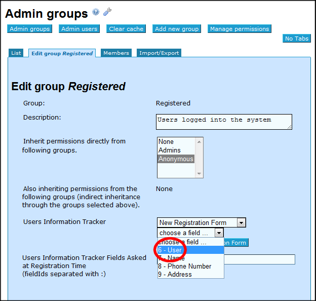 - Registered 그룹을 재편집하십시오. 사용자 정보 트래커 가 이제 트래커 내부에 필드들의 2번째 드롭 목록이 있게 됩니다.