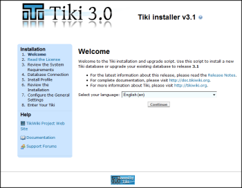 Tiki安装程序的第一页出现,此安装程序将允许您: