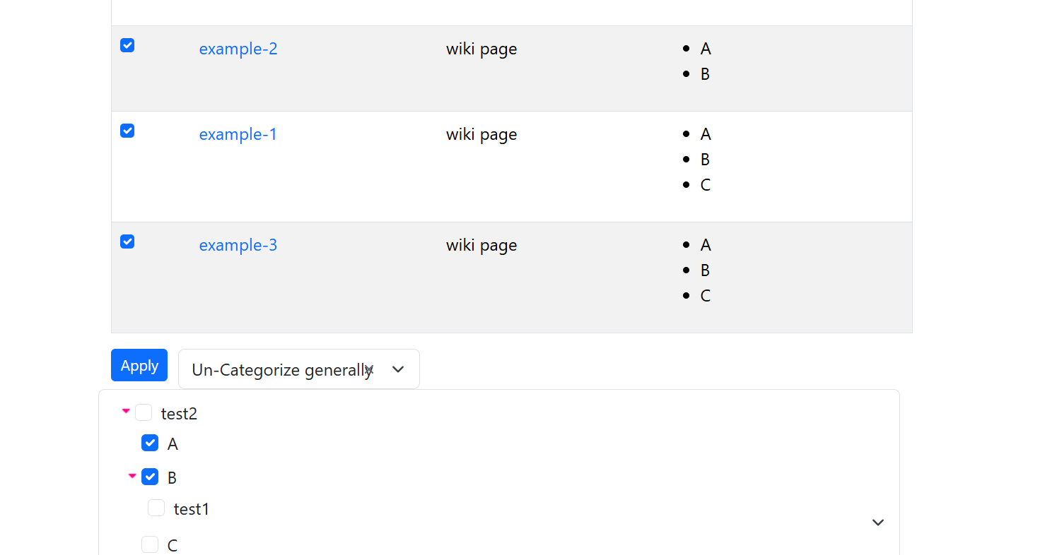 Example 3: Add/delete wiki pages to be selected from the categories (multiple categories) indicated in the tree category. In this example, PluginListexecute combines the two actions (add/remove).