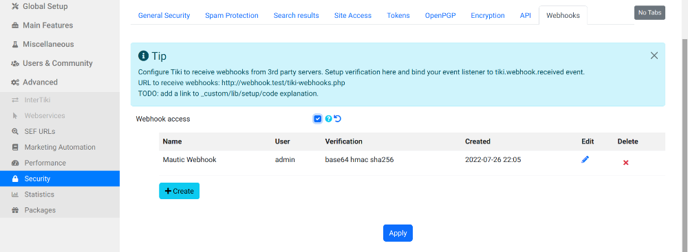 - Go to Tiki admin -> Advanced -> security -> webhooks (Tab)