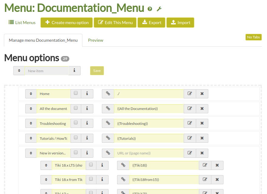 Once created, click the configuration button on this new menu's row, which will take you to /tiki-admin_menu_options.php?menuId=n